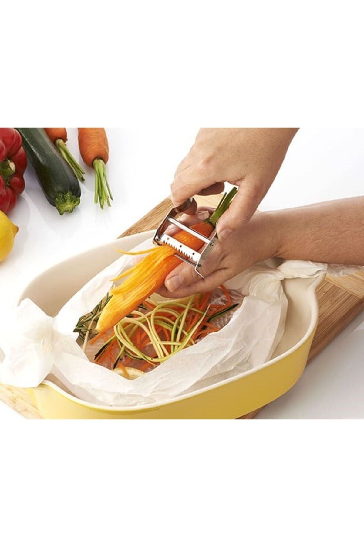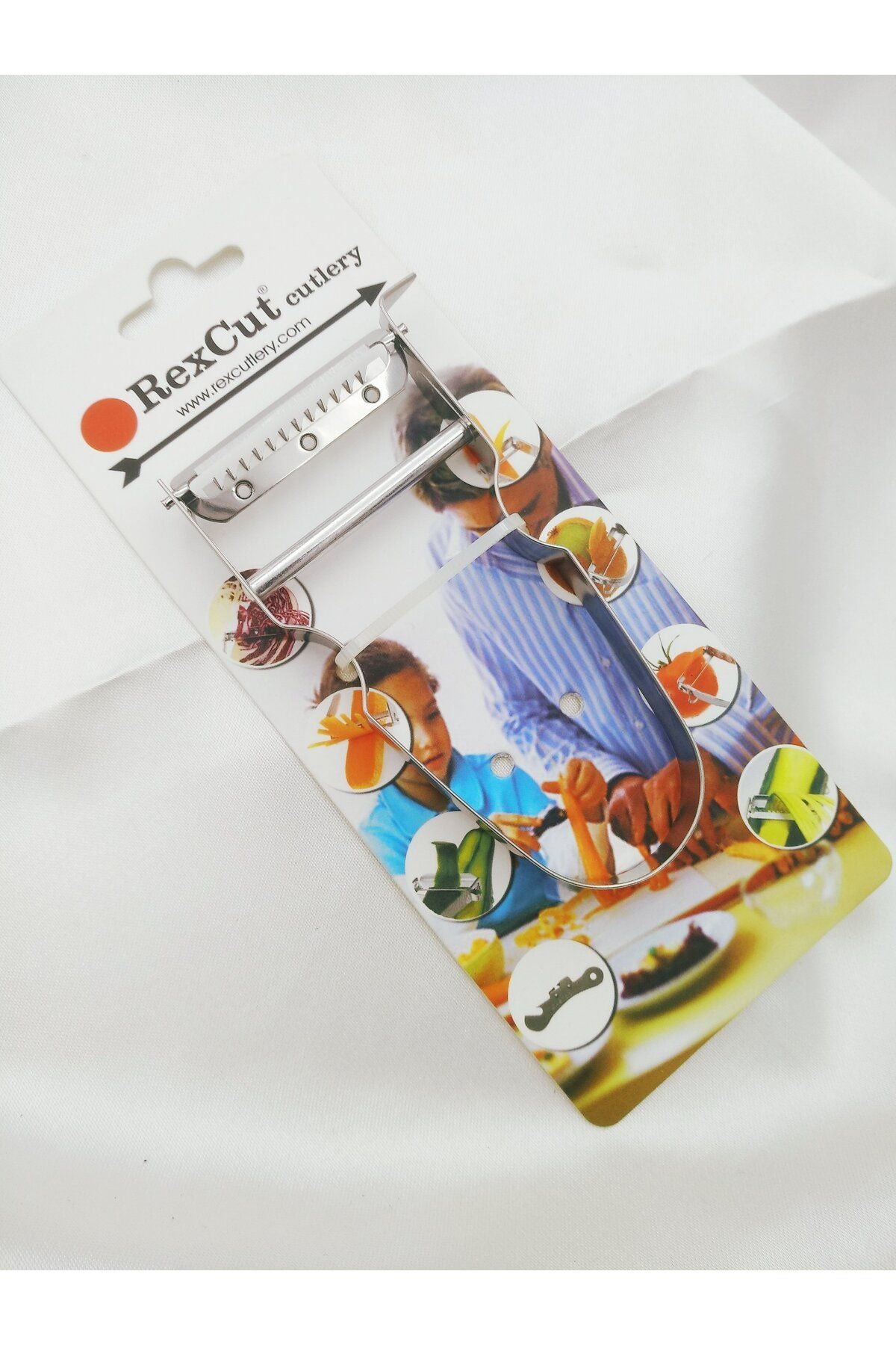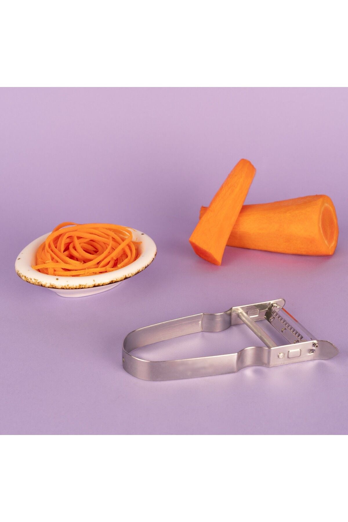 - Sebze, meyve, peynir çubuklarının hızlı ve kolay kesilmesi için Castor Julienne soyucu.