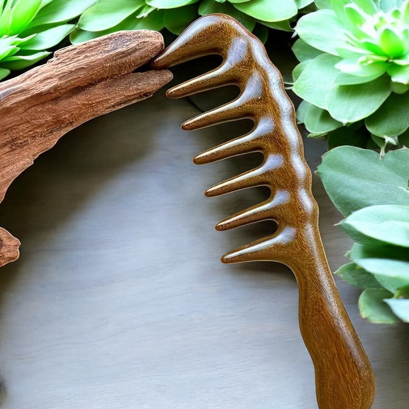 - Bu sandal ağacından yapılmış geniş dişli tarak, her türlü saç tipi için uygun olup, saç derisine masaj yapma özelliğiyle kan dolaşımını artırır.